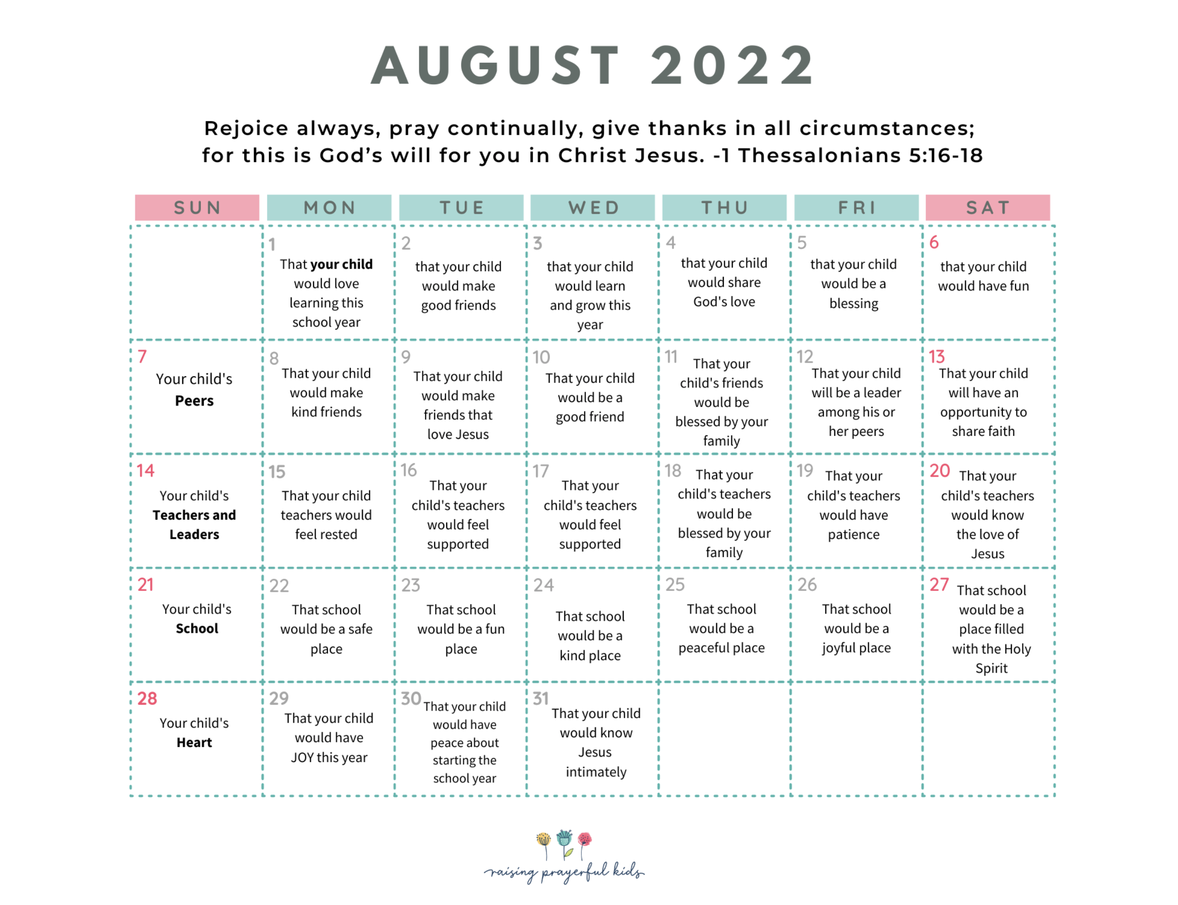 Firstly, thank God for the new adults in your kids' lives-- teachers, teacher's aides, nursery workers, coaches, tutors, babysitters, etc. Thank Him for these special grown-ups who are willing to pour into the next generation and positively influence these young hearts. Thank him for your teachers by name. Thank God for pairing your son or daughter up with this specific teacher according to his will.